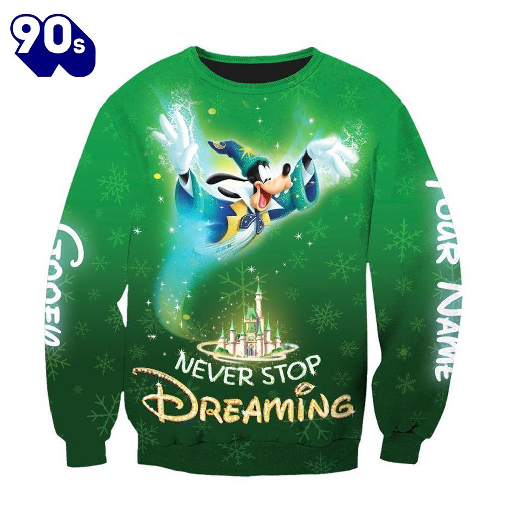 Cartoon Character Never Stop Dreaming Goofy Personalized Custom Name Hoodie All Over Printed 3D Unisex Men Women The 3D Shirt is a fashion statement that goes beyond the ordinary. Using advanced printing technology, it brings designs to life with depth and vividness. Crafted from high-quality materials, it offers comfort and durability. The three-dimensional graphics create a captivating effect that’s perfect for casual wear or making a bold statement. Whether you’re expressing your fandom or showcasing your unique taste, the 3D Shirt is a wearable work of art that sets you apart from the crowd.