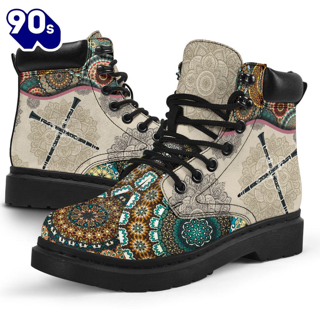 Clarinet Vintage Mandala Asboot All Season Boots Gift Xmas Boots are versatile footwear designed to provide both style and functionality. Typically made from materials like leather, suede, or synthetic fabrics, they come in various heights, from ankle to knee-high. Boots can be found in numerous styles, including casual, formal, and rugged designs, making them suitable for a wide range of occasions. With features like waterproofing, insulation, and sturdy soles, they offer comfort and protection in various weather conditions. Whether paired with jeans for a casual look or dressed up with a skirt, boots are a timeless addition to any wardrobe, combining practicality with fashion.