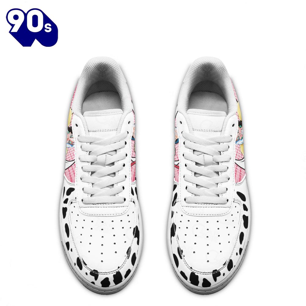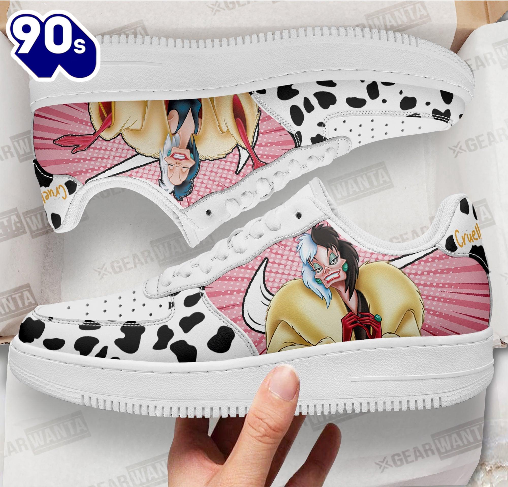 Cruella de Vil Air Sneakers Custom Shoes Air Force 1 shoes are iconic sneakers that blend basketball heritage with streetwear style. Named after the aircraft that carries the President of the United States, these shoes feature a classic silhouette with a padded collar for comfort and a durable leather upper. The Air cushioning technology in the sole provides exceptional support, making them not only stylish but also practical for everyday wear. Over the years, Air Force 1s have transcended their athletic origins, becoming a cultural symbol in music, fashion, and art, often customized in various colors and designs to reflect individual style. Their timeless appeal and versatility ensure they remain a staple in sneaker culture.