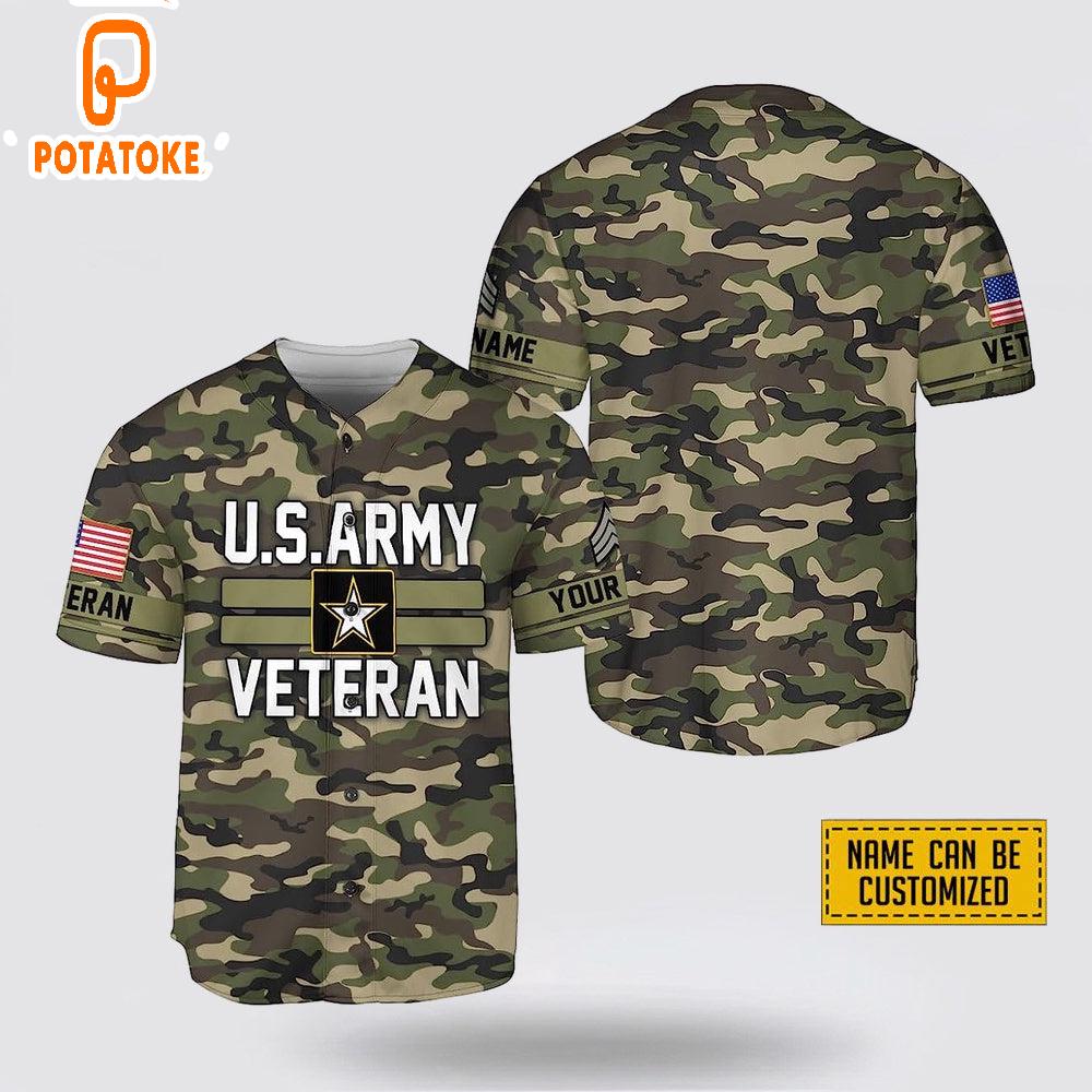 Custom Name US Army Veteran Rank American Flag Camouflage Pattern Baseball Jersey 4th Of July