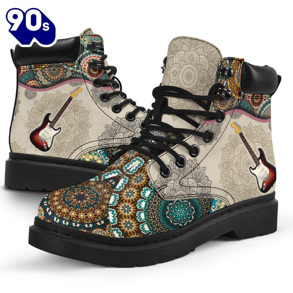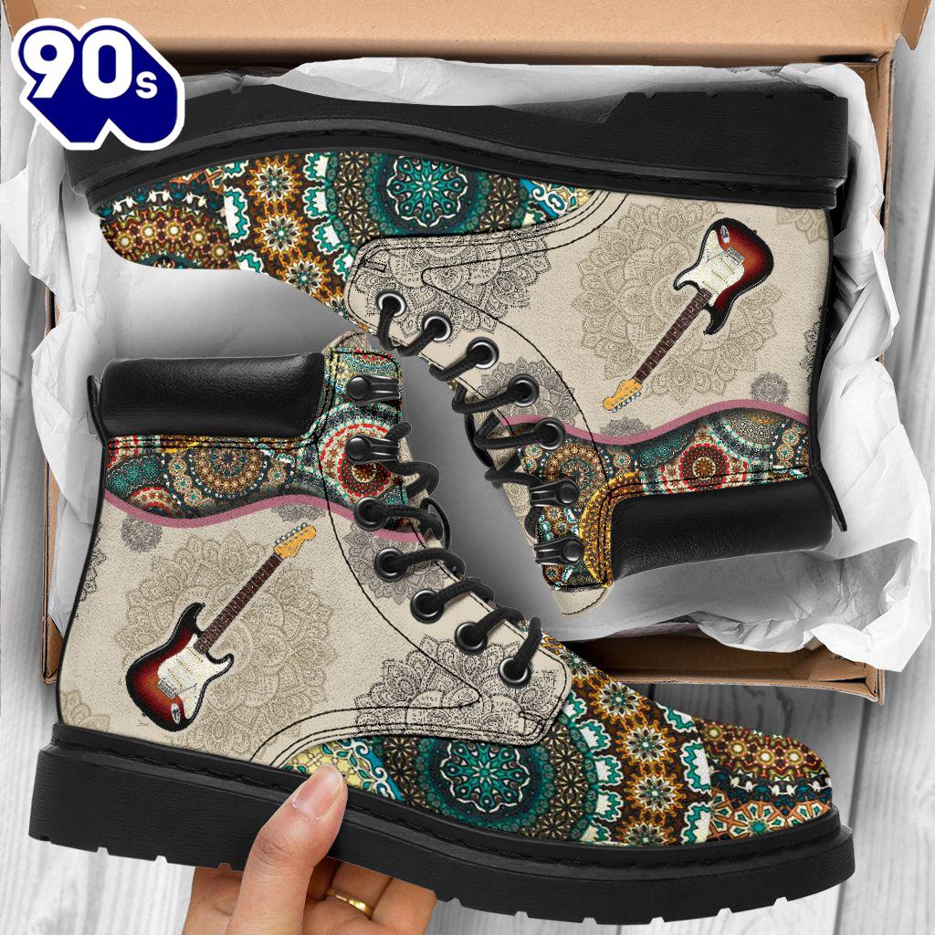 Electric Guitar Vintage Mandala Asboot All Season Boots Gift Xmas Boots are versatile footwear designed to provide both style and functionality. Typically made from materials like leather, suede, or synthetic fabrics, they come in various heights, from ankle to knee-high. Boots can be found in numerous styles, including casual, formal, and rugged designs, making them suitable for a wide range of occasions. With features like waterproofing, insulation, and sturdy soles, they offer comfort and protection in various weather conditions. Whether paired with jeans for a casual look or dressed up with a skirt, boots are a timeless addition to any wardrobe, combining practicality with fashion.