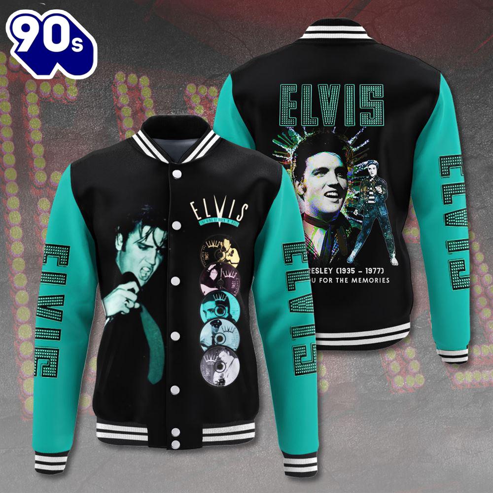 Elvis Presley King Of Music Varsity Jacket Gift Xmas A Baseball Jacket also known as a varsity jacket or letterman jacket, is a classic piece of outerwear traditionally associated with American college and high school sports teams. It typically features a wool or cotton body with contrasting leather or synthetic sleeves, and a ribbed collar, cuffs, and hem. The jacket is often decorated with patches, letters, or logos representing a team, school, or sport. Its timeless design combines sporty and casual elements, making it popular not only among athletes but also as a fashionable streetwear item. The baseball jacket is both functional and stylish, offering warmth and a relaxed fit.