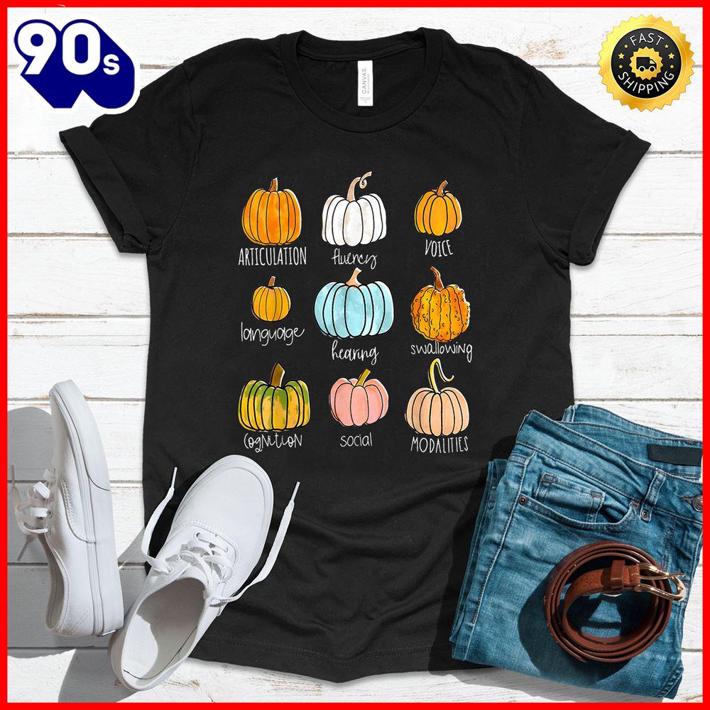 Halloween 2025 Retro Speech Therapy Pumpkin For Sped Teachers Slp Pumpkin T-Shirt This versatile T-shirt is perfect for everyone, combining style and comfort. Made from soft, high-quality fabric, it features a classic fit that suits any body type. Ideal for casual wear or layering, this T-shirt comes in a variety of colors to match any wardrobe. Its durable construction ensures long-lasting wear, making it a staple piece for both men and women