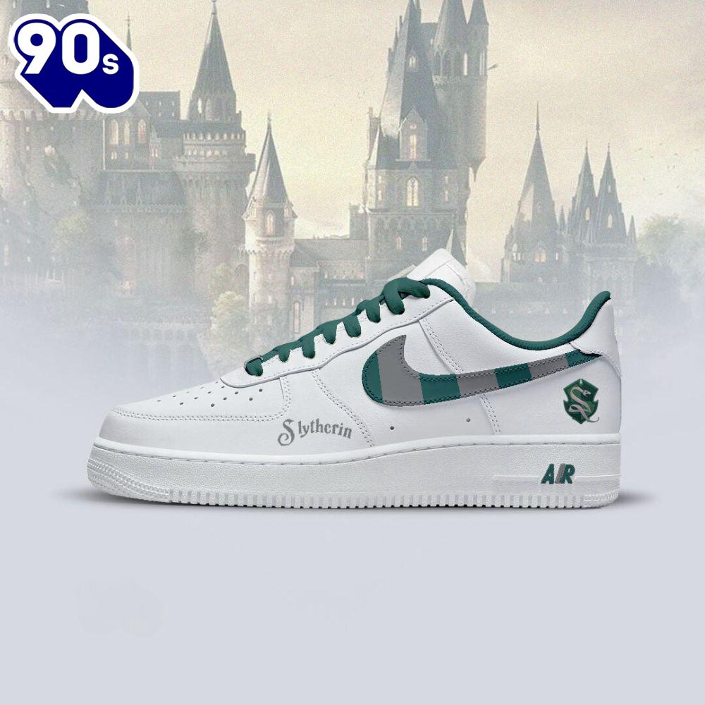 Hogwart White Sytherin AF1 Shoes Air Force 1 shoes are iconic sneakers that blend basketball heritage with streetwear style. Named after the aircraft that carries the President of the United States, these shoes feature a classic silhouette with a padded collar for comfort and a durable leather upper. The Air cushioning technology in the sole provides exceptional support, making them not only stylish but also practical for everyday wear. Over the years, Air Force 1s have transcended their athletic origins, becoming a cultural symbol in music, fashion, and art, often customized in various colors and designs to reflect individual style. Their timeless appeal and versatility ensure they remain a staple in sneaker culture.