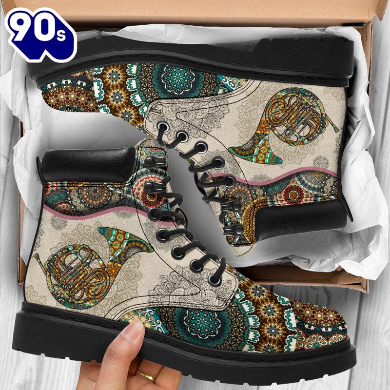 Horn Vintage Mandala Asboot Music Gift All Season Boots Gift Xmas Boots are versatile footwear designed to provide both style and functionality. Typically made from materials like leather, suede, or synthetic fabrics, they come in various heights, from ankle to knee-high. Boots can be found in numerous styles, including casual, formal, and rugged designs, making them suitable for a wide range of occasions. With features like waterproofing, insulation, and sturdy soles, they offer comfort and protection in various weather conditions. Whether paired with jeans for a casual look or dressed up with a skirt, boots are a timeless addition to any wardrobe, combining practicality with fashion.