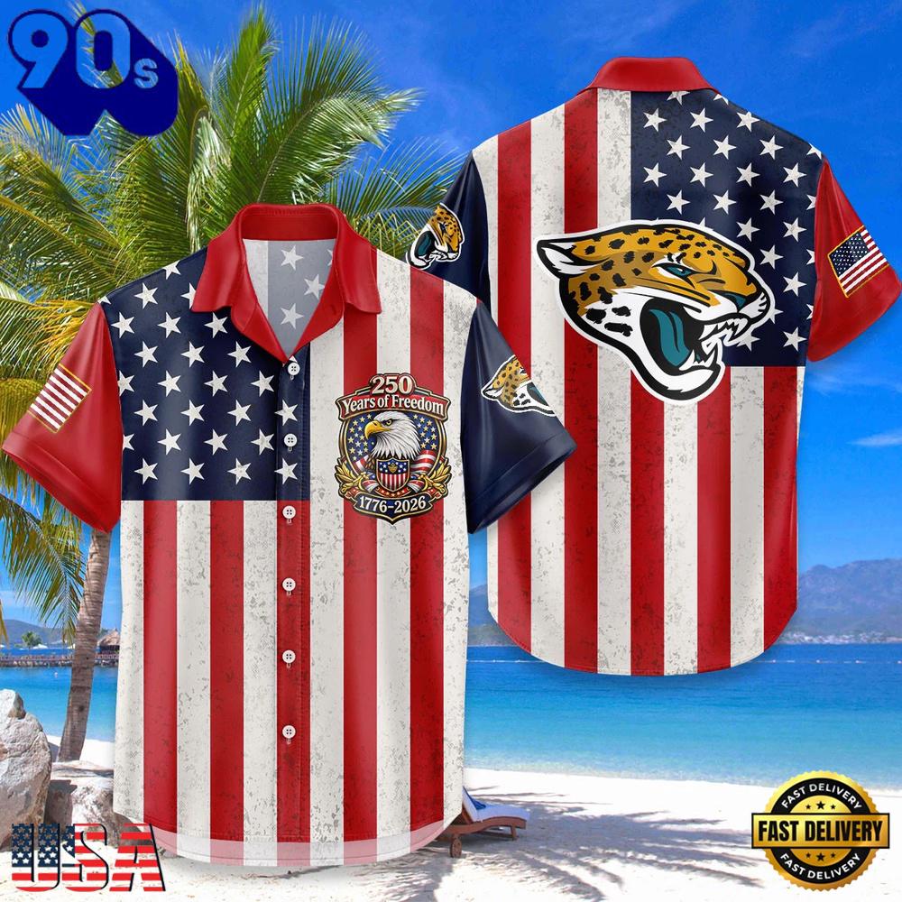 Jacksonville Jaguars USA Flag 250 Years of Freedom Anniversary 1776-2026 Aloha Hawaiian Shirt The Hawaiian Shirt is an iconic symbol of laid-back, tropical style. Crafted from lightweight, breathable fabrics, it offers a comfortable and relaxed fit, perfect for warm weather escapades. Its vibrant, exotic patterns evoke the spirit of the Hawaiian islands, radiating a sense of fun and adventure. With its button-up design and collared finish, it strikes the perfect balance between casual and smart-casual attire. Whether you’re strolling along the beach or attending a summer soirée, the Hawaiian Shirt exudes a carefree charm that’s synonymous with leisure and relaxation. Embrace the spirit of aloha and infuse a touch of paradise into your wardrobe with this classic and timeless piece of attire.