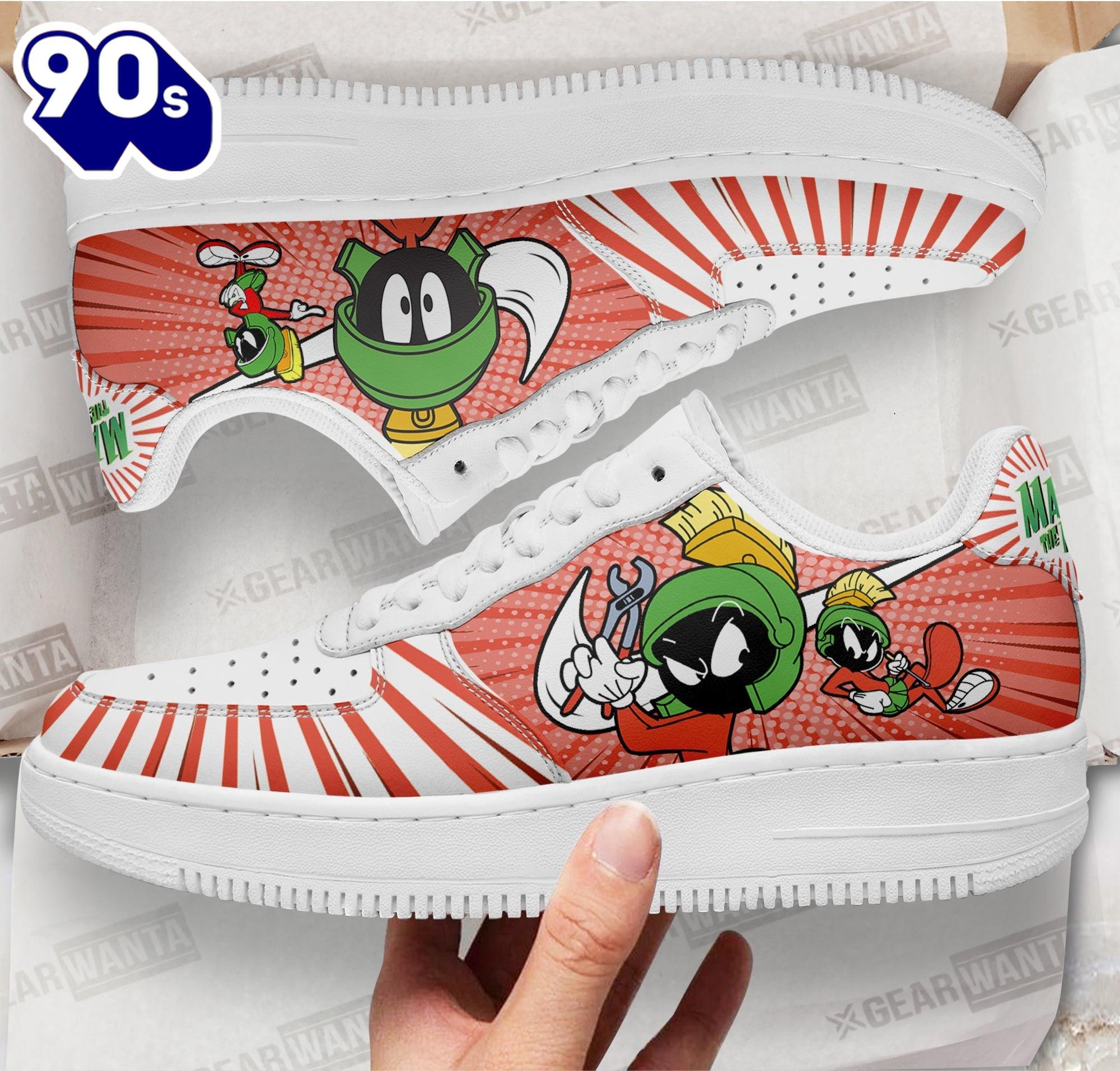Looney Tunes Marvin Air Sneakers Custom Air Force 1 shoes are iconic sneakers that blend basketball heritage with streetwear style. Named after the aircraft that carries the President of the United States, these shoes feature a classic silhouette with a padded collar for comfort and a durable leather upper. The Air cushioning technology in the sole provides exceptional support, making them not only stylish but also practical for everyday wear. Over the years, Air Force 1s have transcended their athletic origins, becoming a cultural symbol in music, fashion, and art, often customized in various colors and designs to reflect individual style. Their timeless appeal and versatility ensure they remain a staple in sneaker culture.