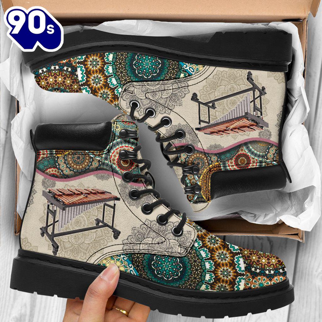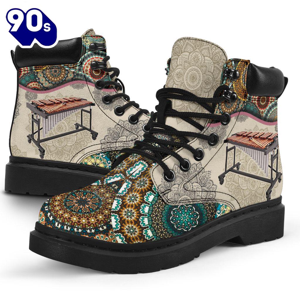 Marimba Vintage Mandala Asboot All Season Boots Gift Xmas Boots are versatile footwear designed to provide both style and functionality. Typically made from materials like leather, suede, or synthetic fabrics, they come in various heights, from ankle to knee-high. Boots can be found in numerous styles, including casual, formal, and rugged designs, making them suitable for a wide range of occasions. With features like waterproofing, insulation, and sturdy soles, they offer comfort and protection in various weather conditions. Whether paired with jeans for a casual look or dressed up with a skirt, boots are a timeless addition to any wardrobe, combining practicality with fashion.