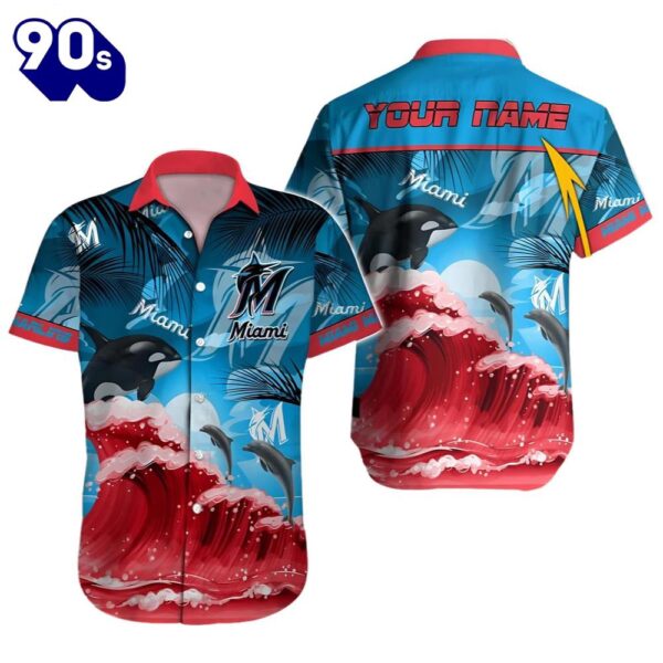 Product details: Mlb Miami Marlins Hawaiian Button Up Shirts Customizable Name