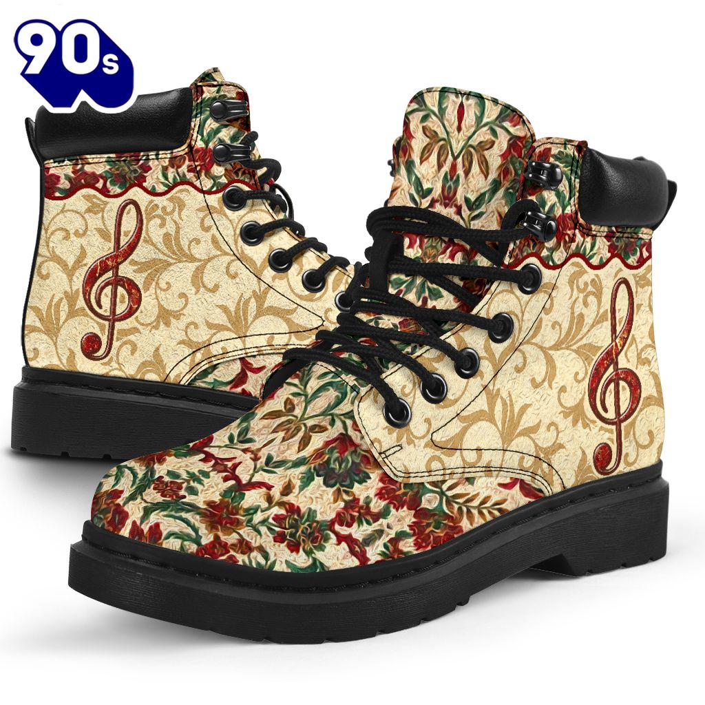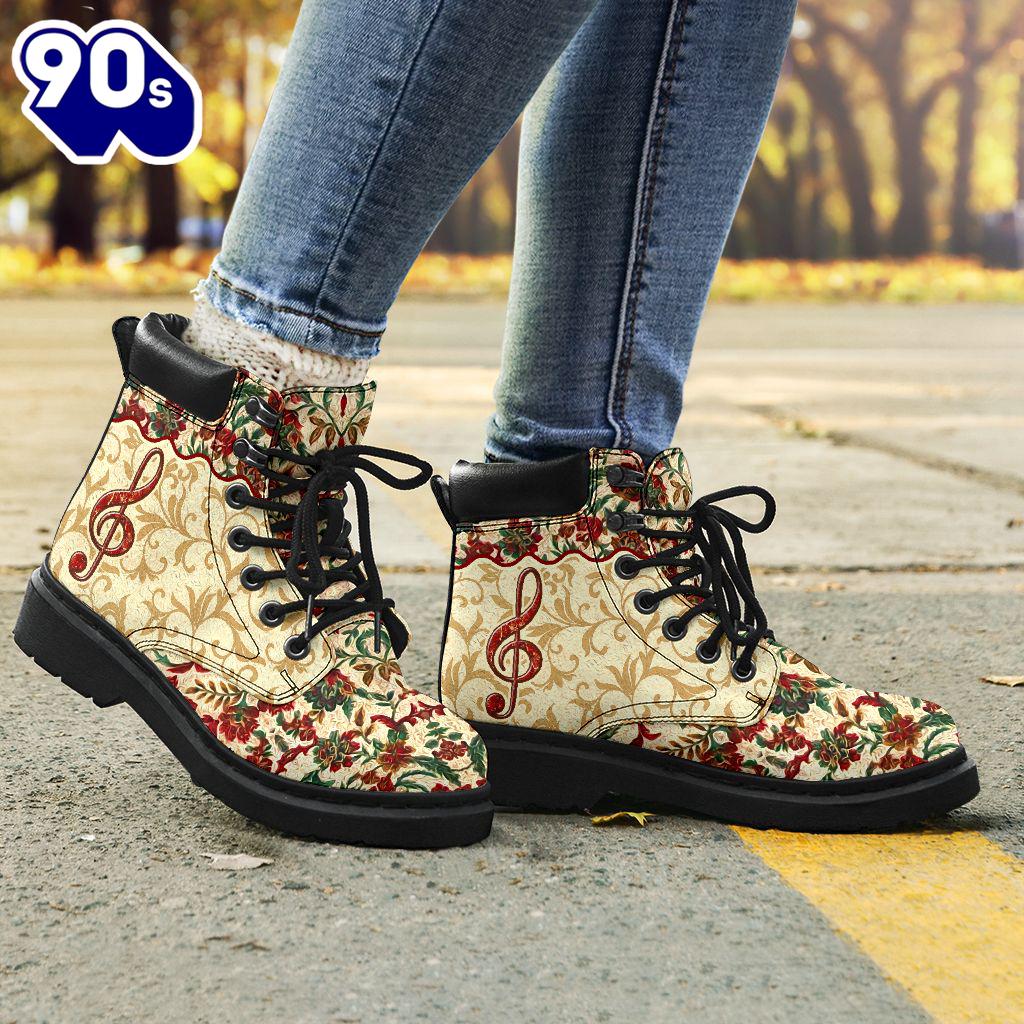 Music Flower Red Classic Vintage Asboot All Season Boots Gift Xmas Boots are versatile footwear designed to provide both style and functionality. Typically made from materials like leather, suede, or synthetic fabrics, they come in various heights, from ankle to knee-high. Boots can be found in numerous styles, including casual, formal, and rugged designs, making them suitable for a wide range of occasions. With features like waterproofing, insulation, and sturdy soles, they offer comfort and protection in various weather conditions. Whether paired with jeans for a casual look or dressed up with a skirt, boots are a timeless addition to any wardrobe, combining practicality with fashion.