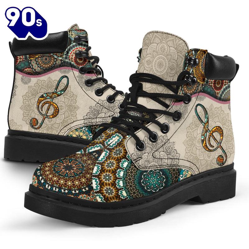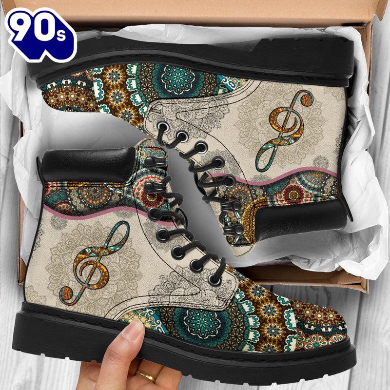 Music Vintage Mandala Asboot Music Gift All Season Boots Gift Xmas Boots are versatile footwear designed to provide both style and functionality. Typically made from materials like leather, suede, or synthetic fabrics, they come in various heights, from ankle to knee-high. Boots can be found in numerous styles, including casual, formal, and rugged designs, making them suitable for a wide range of occasions. With features like waterproofing, insulation, and sturdy soles, they offer comfort and protection in various weather conditions. Whether paired with jeans for a casual look or dressed up with a skirt, boots are a timeless addition to any wardrobe, combining practicality with fashion.