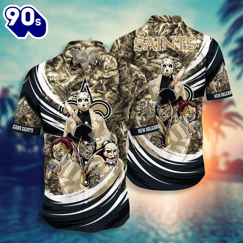 New Orleans Saints NFL Halloween Horror Movies Hawaiian Shirts The Hawaiian Shirt is an iconic symbol of laid-back, tropical style. Crafted from lightweight, breathable fabrics, it offers a comfortable and relaxed fit, perfect for warm weather escapades. Its vibrant, exotic patterns evoke the spirit of the Hawaiian islands, radiating a sense of fun and adventure. With its button-up design and collared finish, it strikes the perfect balance between casual and smart-casual attire. Whether you’re strolling along the beach or attending a summer soirée, the Hawaiian Shirt exudes a carefree charm that’s synonymous with leisure and relaxation. Embrace the spirit of aloha and infuse a touch of paradise into your wardrobe with this classic and timeless piece of attire.