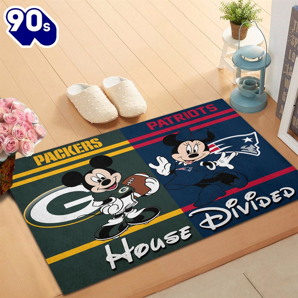 NFL Football Green Bay Packers vs New England Patriots Mickey And Minnie Teams NFL House Divided Doormat It’s a welcoming embrace that sets the tone for your home. Placed at the threshold, a doormat serves as the first point of contact, offering a friendly gesture to all who enter. Crafted from a variety of materials, designs, and colors, a doormat not only keeps the dirt and debris at bay but also adds a touch of personality to your space.