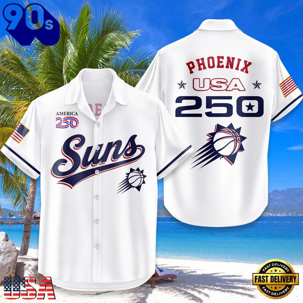Phoenix Suns USA Flag 250 Years of Freedom Anniversary 1776-2026 Aloha Hawaiian Shirt The Hawaiian Shirt is an iconic symbol of laid-back, tropical style. Crafted from lightweight, breathable fabrics, it offers a comfortable and relaxed fit, perfect for warm weather escapades. Its vibrant, exotic patterns evoke the spirit of the Hawaiian islands, radiating a sense of fun and adventure. With its button-up design and collared finish, it strikes the perfect balance between casual and smart-casual attire. Whether you’re strolling along the beach or attending a summer soirée, the Hawaiian Shirt exudes a carefree charm that’s synonymous with leisure and relaxation. Embrace the spirit of aloha and infuse a touch of paradise into your wardrobe with this classic and timeless piece of attire.