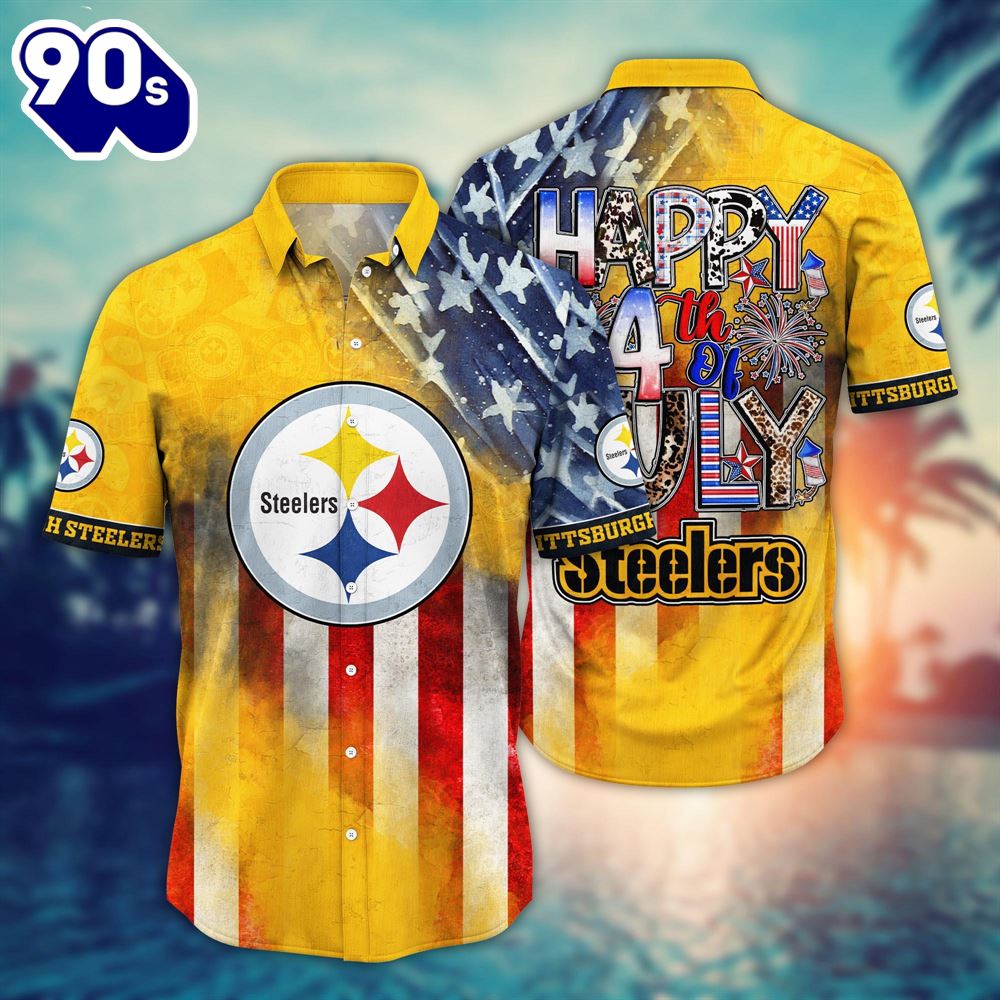 Pittsburgh Steelers NFL Happy 4th Of July Hawaiian Shirt The Hawaiian Shirt is an iconic symbol of laid-back, tropical style. Crafted from lightweight, breathable fabrics, it offers a comfortable and relaxed fit, perfect for warm weather escapades. Its vibrant, exotic patterns evoke the spirit of the Hawaiian islands, radiating a sense of fun and adventure. With its button-up design and collared finish, it strikes the perfect balance between casual and smart-casual attire. Whether you’re strolling along the beach or attending a summer soirée, the Hawaiian Shirt exudes a carefree charm that’s synonymous with leisure and relaxation. Embrace the spirit of aloha and infuse a touch of paradise into your wardrobe with this classic and timeless piece of attire.