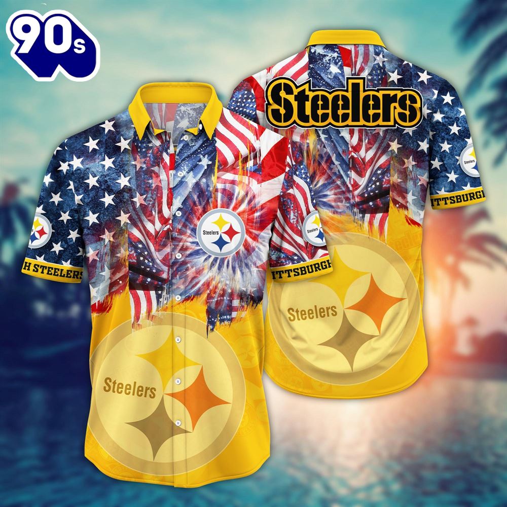 Pittsburgh Steelers NFL US Flaq 4th Of July Hawaiian Shirt For Fans Trending Summer Football Shirts The Hawaiian Shirt is an iconic symbol of laid-back, tropical style. Crafted from lightweight, breathable fabrics, it offers a comfortable and relaxed fit, perfect for warm weather escapades. Its vibrant, exotic patterns evoke the spirit of the Hawaiian islands, radiating a sense of fun and adventure. With its button-up design and collared finish, it strikes the perfect balance between casual and smart-casual attire. Whether you’re strolling along the beach or attending a summer soirée, the Hawaiian Shirt exudes a carefree charm that’s synonymous with leisure and relaxation. Embrace the spirit of aloha and infuse a touch of paradise into your wardrobe with this classic and timeless piece of attire.