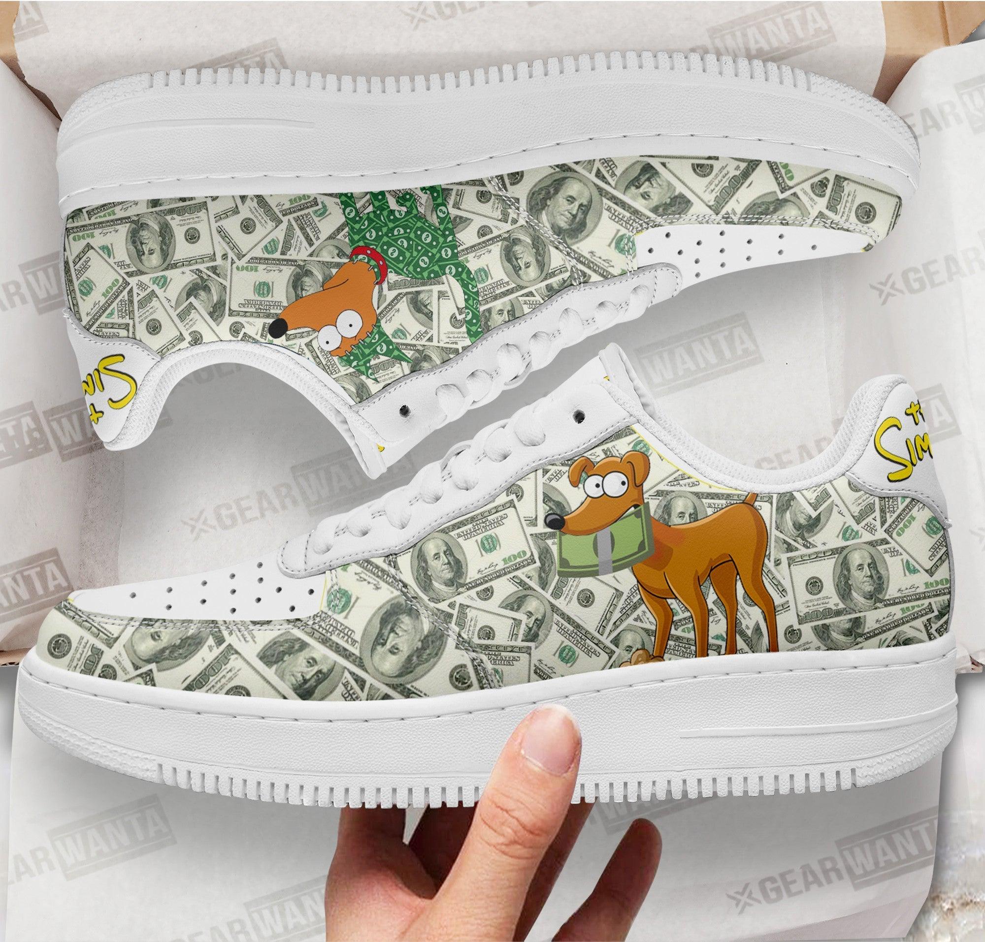 Santa’s Little Helper Air Sneakers Custom Simpson Cartoon Shoes Air Force 1 shoes are iconic sneakers that blend basketball heritage with streetwear style. Named after the aircraft that carries the President of the United States, these shoes feature a classic silhouette with a padded collar for comfort and a durable leather upper. The Air cushioning technology in the sole provides exceptional support, making them not only stylish but also practical for everyday wear. Over the years, Air Force 1s have transcended their athletic origins, becoming a cultural symbol in music, fashion, and art, often customized in various colors and designs to reflect individual style. Their timeless appeal and versatility ensure they remain a staple in sneaker culture.