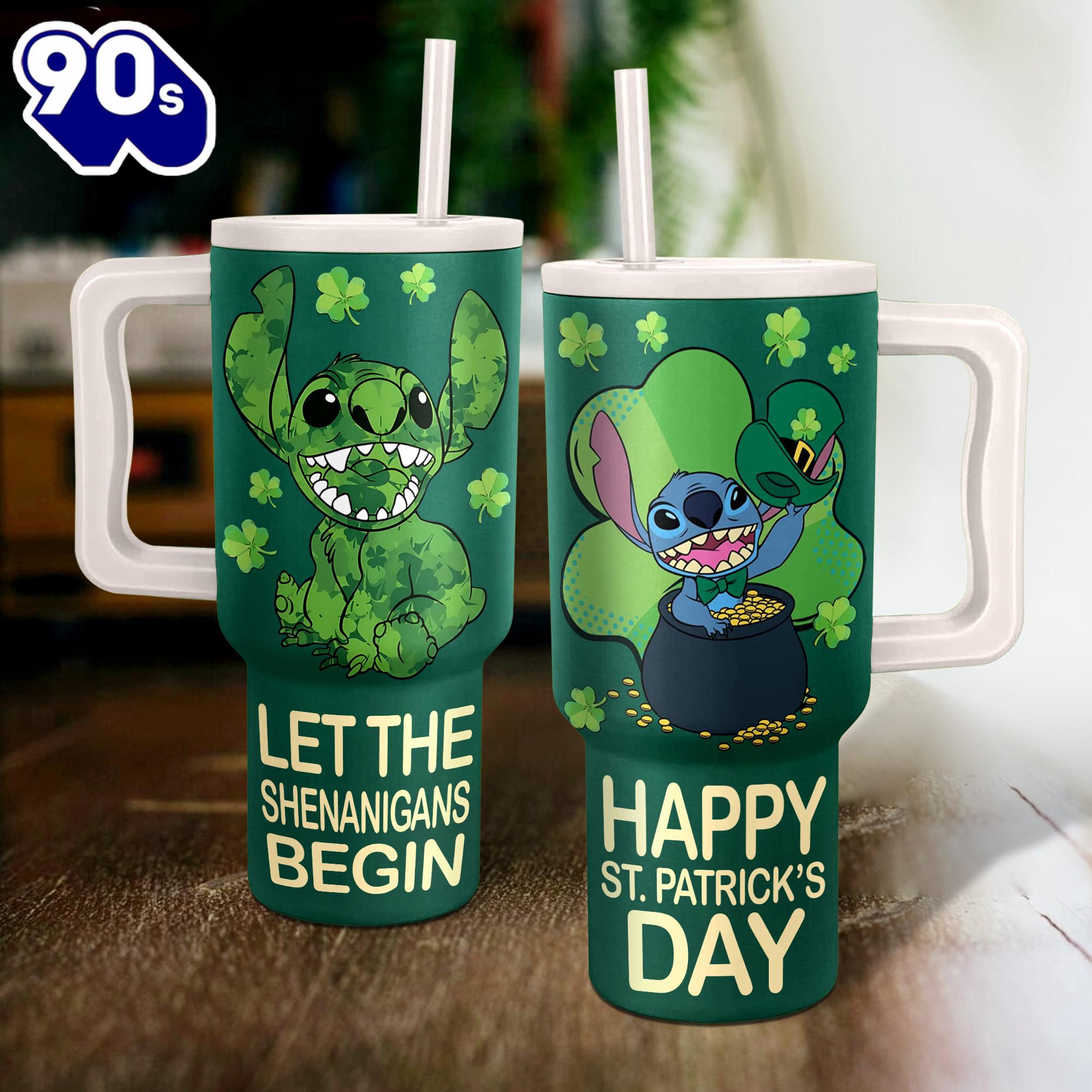 Stitch St. Patrick’s Day Disney Cartoon Custom Stanley Quencher 40oz Stainless Steel Tumbler With Handle