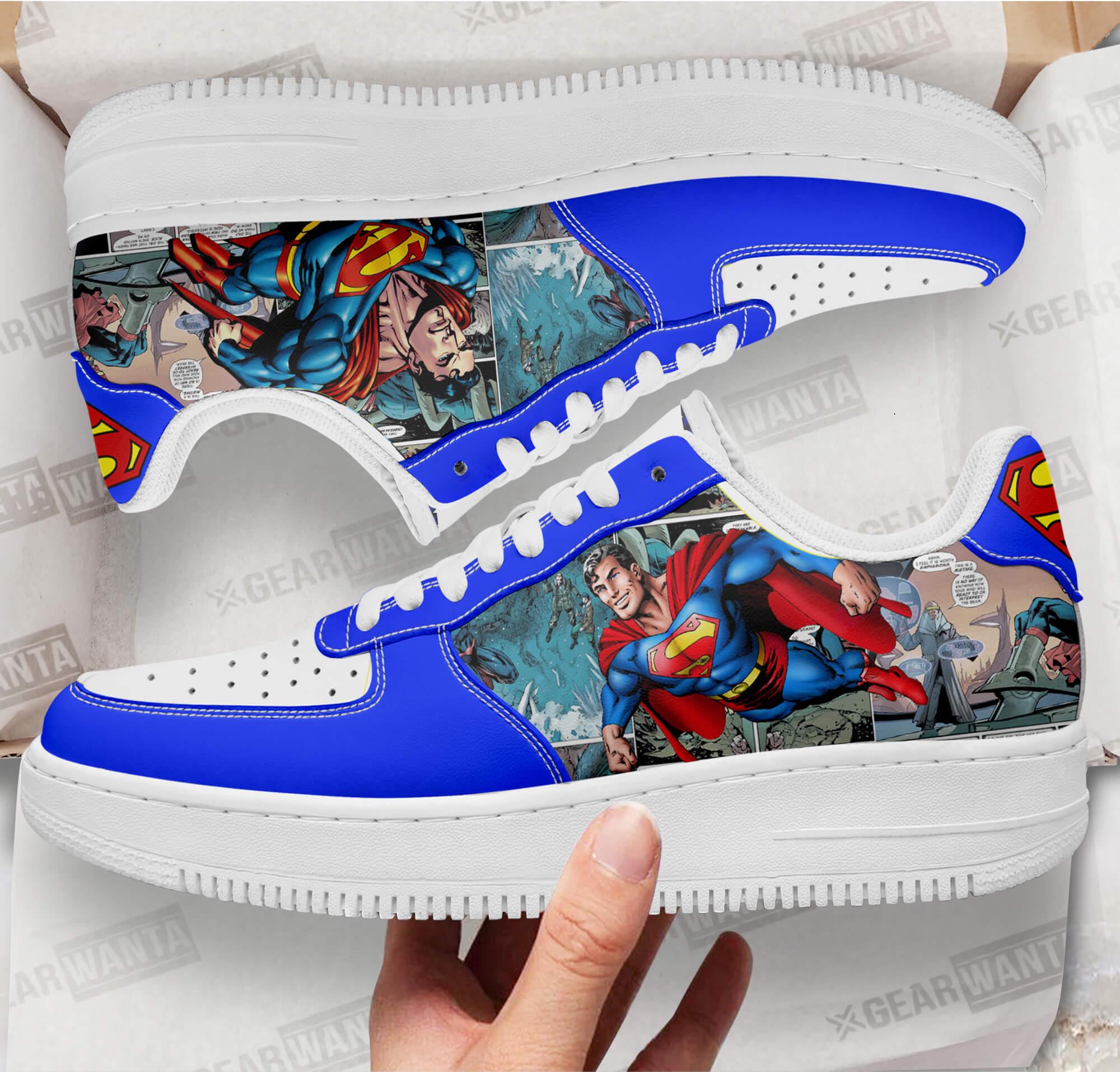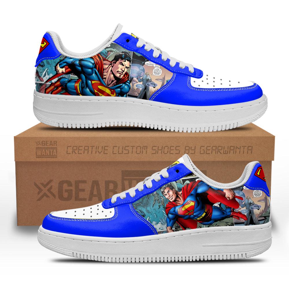 Super Man Air Sneakers Custom Superhero Comic Shoes Air Force 1 shoes are iconic sneakers that blend basketball heritage with streetwear style. Named after the aircraft that carries the President of the United States, these shoes feature a classic silhouette with a padded collar for comfort and a durable leather upper. The Air cushioning technology in the sole provides exceptional support, making them not only stylish but also practical for everyday wear. Over the years, Air Force 1s have transcended their athletic origins, becoming a cultural symbol in music, fashion, and art, often customized in various colors and designs to reflect individual style. Their timeless appeal and versatility ensure they remain a staple in sneaker culture.
