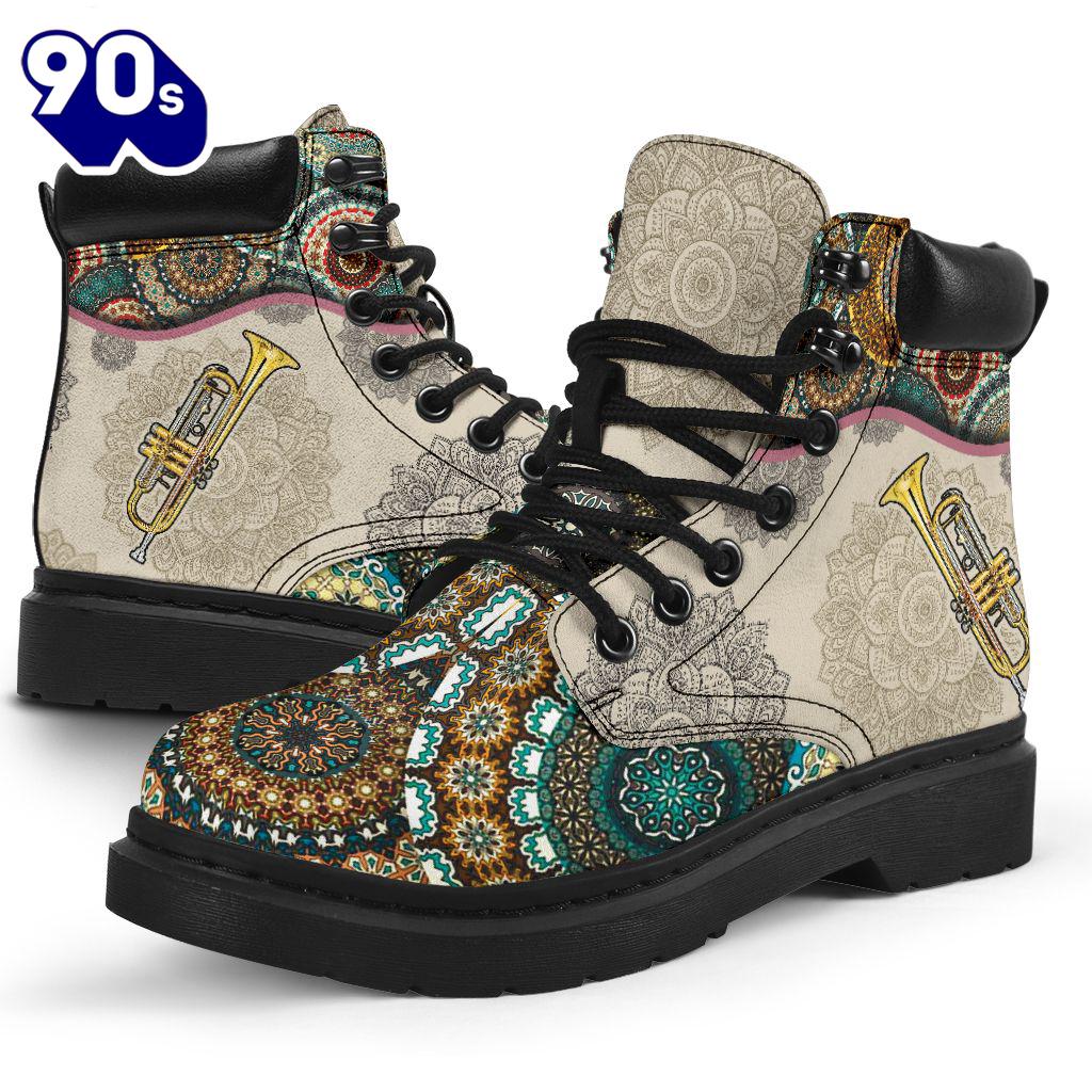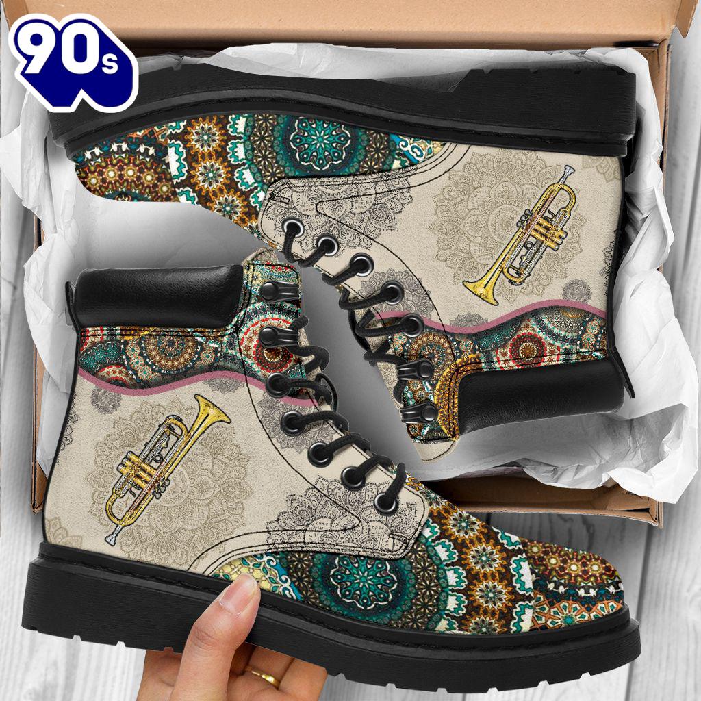 Trumpet Vintage Mandala Asboot All Season Boots Gift Xmas Boots are versatile footwear designed to provide both style and functionality. Typically made from materials like leather, suede, or synthetic fabrics, they come in various heights, from ankle to knee-high. Boots can be found in numerous styles, including casual, formal, and rugged designs, making them suitable for a wide range of occasions. With features like waterproofing, insulation, and sturdy soles, they offer comfort and protection in various weather conditions. Whether paired with jeans for a casual look or dressed up with a skirt, boots are a timeless addition to any wardrobe, combining practicality with fashion.
