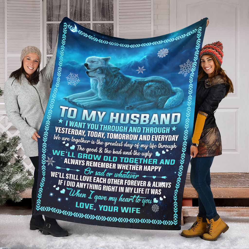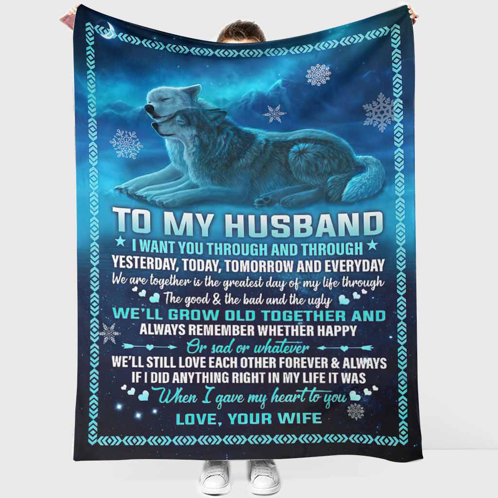 Valentine Day Wolf To My Husband Husband And Wife Blue Fleece Throw Blanket Indulge in ultimate comfort with our exquisite Blankets! Crafted from the finest materials, these blankets offer a luxurious feel and unparalleled coziness. Designed to keep you snug and warm during chilly nights or lazy afternoons, they come in various sizes, ensuring there’s a perfect fit for every need. With a wide range of colors, textures, and patterns, these blankets complement any decor, from classic to modern, effortlessly adding a touch of elegance to your space. The premium-quality fabric guarantees durability, softness, and easy maintenance, making them a must-have for your home. Wrap yourself in sheer comfort and style with our plush blankets, creating a haven of relaxation and warmth whenever you need it.